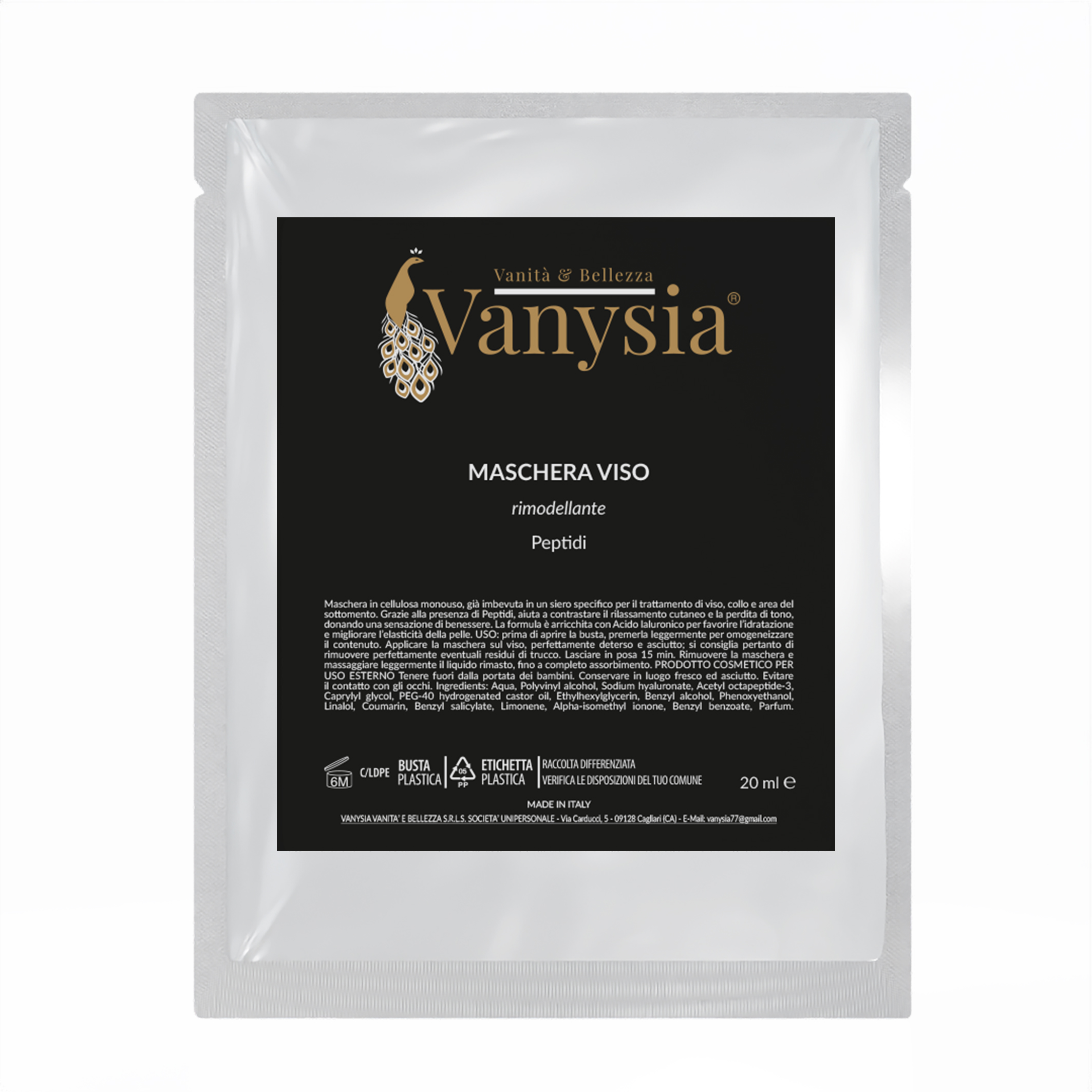 Maschera viso in cellulosa monouso, già imbibita con un siero ad alta concentrazione di attivi funzionali, formulato per il trattamento mirato di viso, collo e area del sottomento. Grazie alla sua struttura in cellulosa biocompatibile, garantisce un’adesione ottimale alla pelle, massimizzando l’assorbimento degli attivi e favorendo un rilascio graduale delle sostanze funzionali. L’azione sinergica dell’ Acetyl octapeptide-3 e dell’acido ialuronico consente di contrastare il rilassamento cutaneo e la perdita di tonicità, migliorando l’elasticità, la compattezza e l’idratazione della pelle. L’utilizzo regolare della maschera conferisce una pelle visibilmente più distesa, elastica e luminosa.